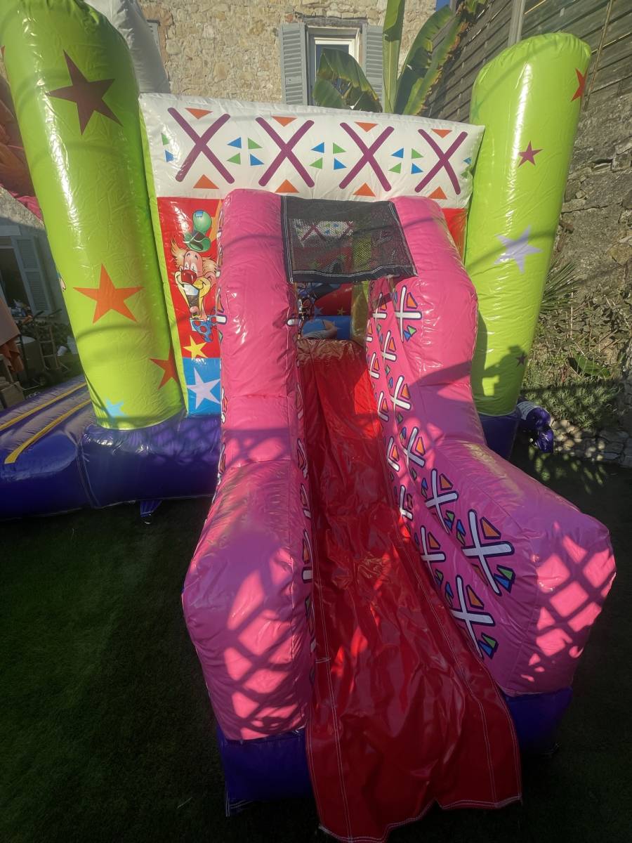 Vous souhaitez faire la fête quoi de mieux que cette structure sur le thème du cirque qui convient à tous les genres qui combine obstacles et petit toboggan.